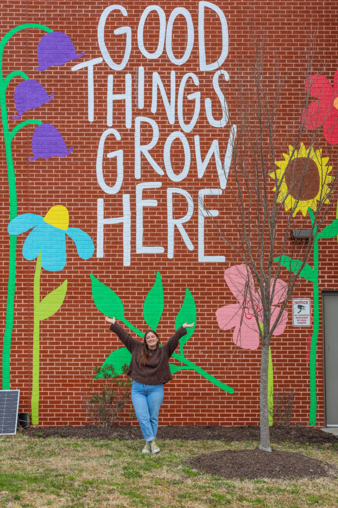 “We were given guidelines to create something inclusive, bright, and uplifting,” Ruby shared. “I have always loved the saying ‘good things grow here’ and thought it was perfect alongside the art already on the wall.”